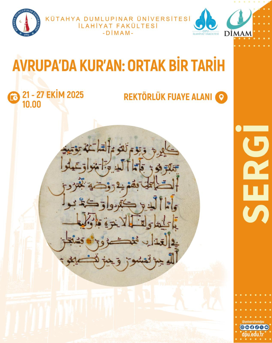İstanbul Üniversitesi İlahiyat Fakültesi tarafından düzenlenen Üniversitemiz İlahiyat Fakültesi ile DİMAM'ın ev sahipliği yaptığı Avrupa'da Kur'ân: Ortak Bir Tarih başlıklı sergi, 21-27 Ekim 2025 tarihleri arasında Rektörlük Fuaye Alanı'nda gerçekleştirilecektir.